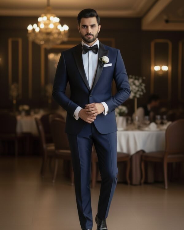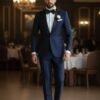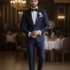 ENHANCE YOUR LOOK WITH THIS BLUE TUXEDO, DESIGNED FOR GROOMS AND SPECIAL EVENTS, FEATURING SATIN PEAK LAPELS FOR A SOPHISTICATED FINISH. CAN BE MADE IN ANY COLOR.