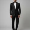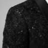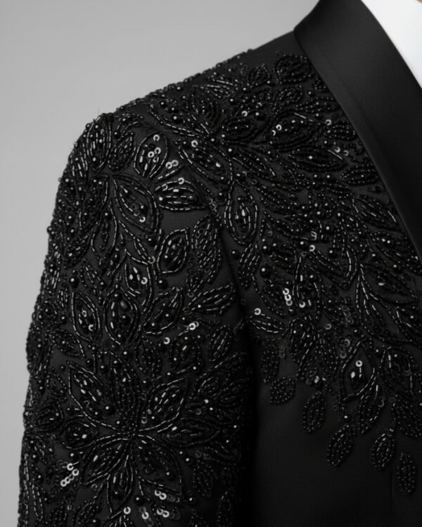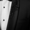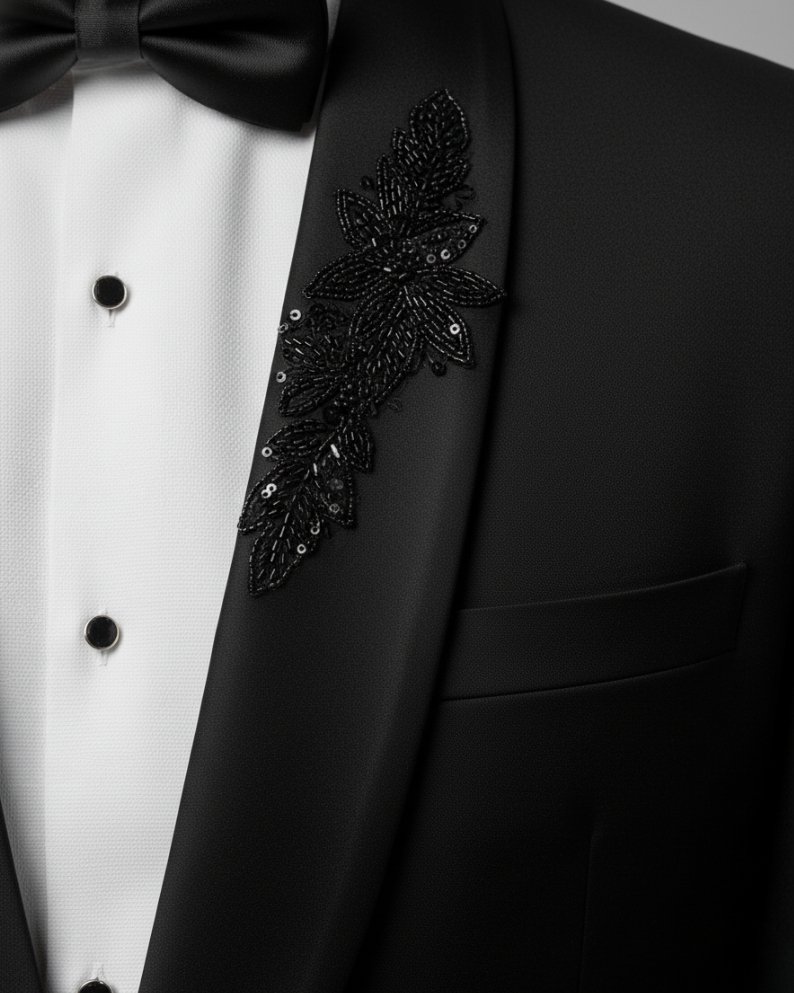 ELEVATE YOUR STYLE WITH THIS HIGH-END BLACK TUXEDO, DESIGNED FOR GROOMS AND SPECIAL EVENTS, FEATURING HAND-EMBROIDERED SHOULDERS AND SATIN PEAK LAPELS WITH INTRICATE DETAILING.