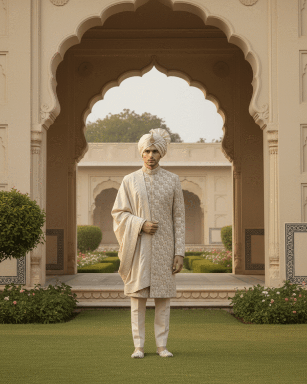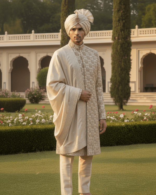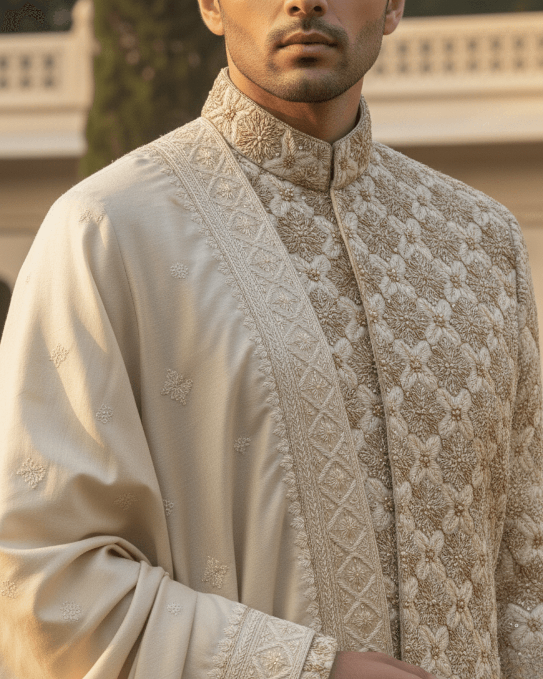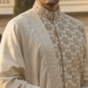 A MASTERPIECE OF CRAFTSMANSHIP, THIS HERITAGE CREAM SHERWANI FEATURES EXQUISITE HAND EMBROIDERY. DESIGNED FOR THE MODERN GROOM WHO VALUES TRADITION.