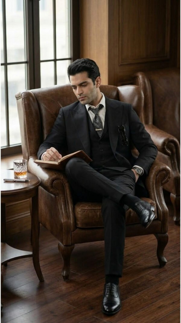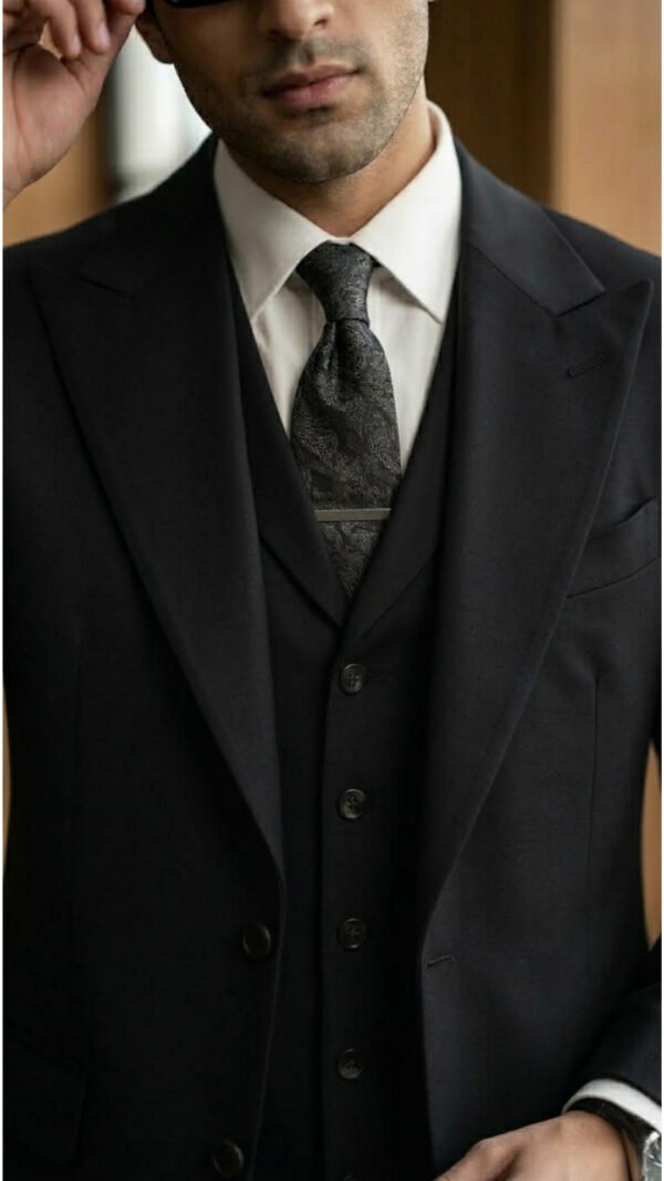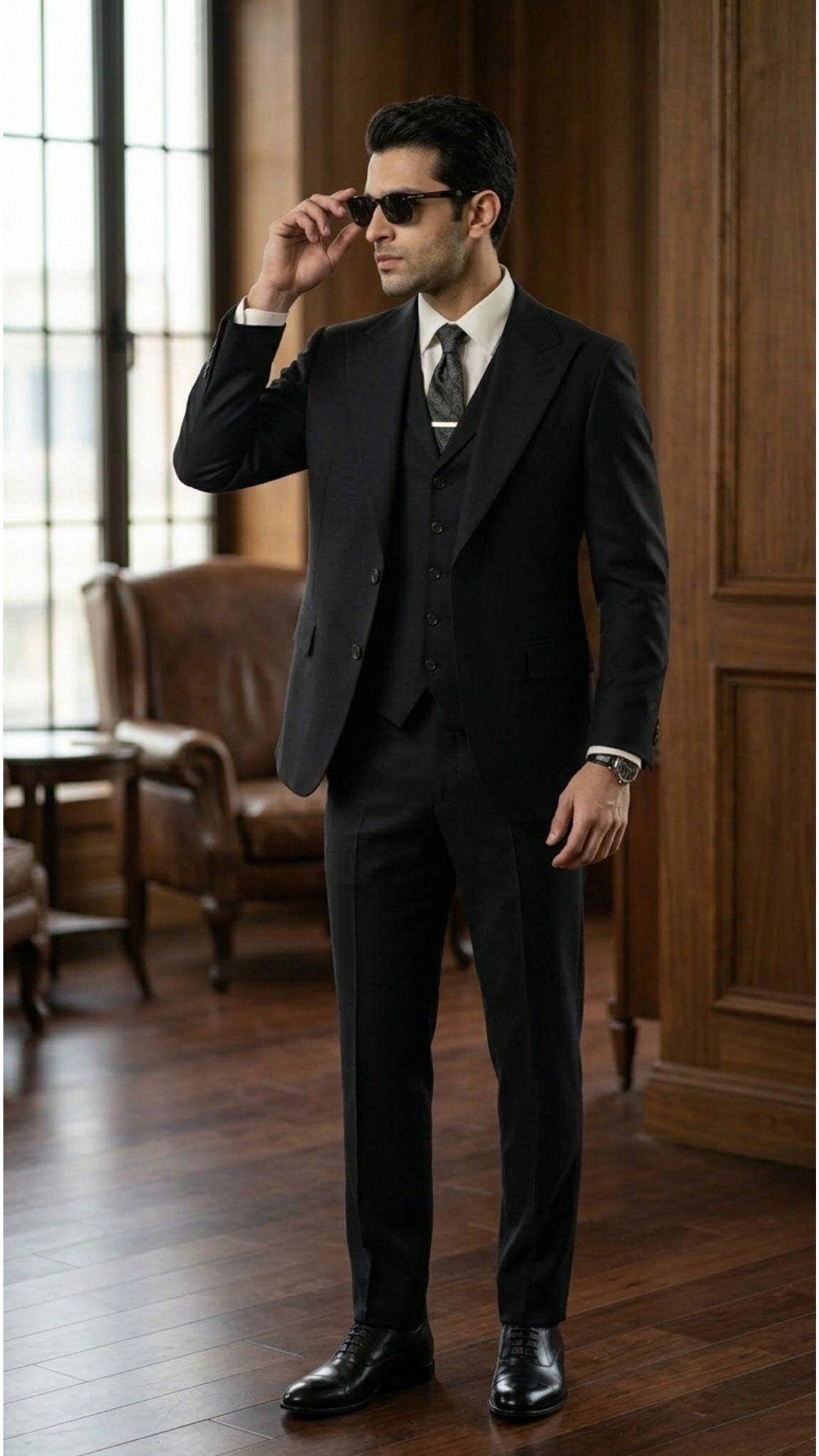 FORMAL BLACK SUIT — A SHARP, MODERN CLASSIC TAILORED IN PREMIUM ITALIAN FABRIC FOR A REFINED AND POWERFUL FORMAL PRESENCE.