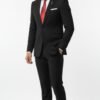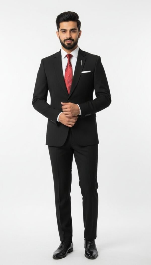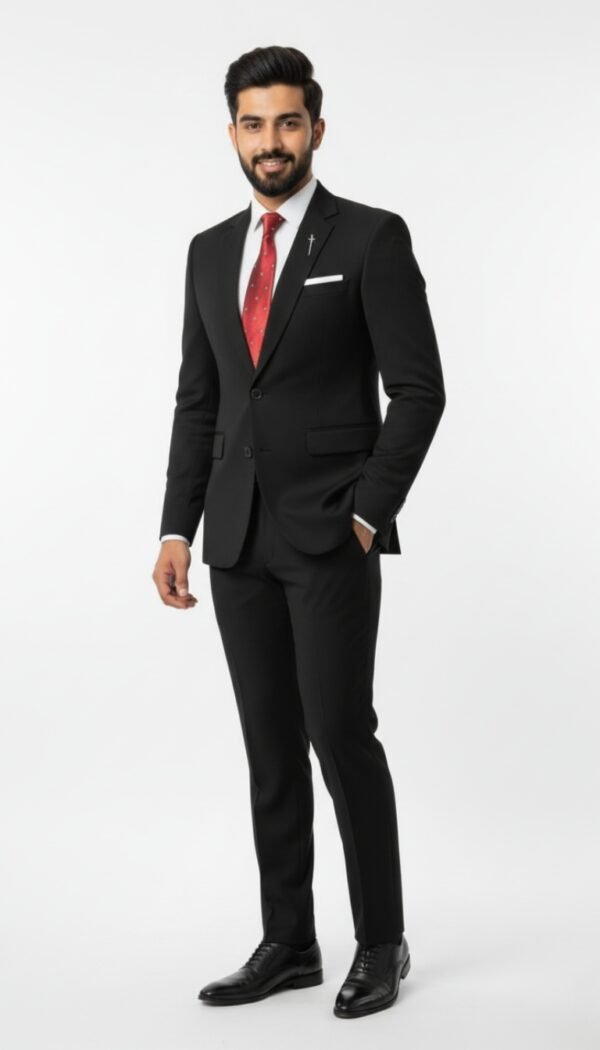 STEP UP YOUR STYLE WITH MAESTRO DESIGNERS. OUR TWO-PIECE JET BLACK SUIT IS EXPERTLY TAILORED IN LUXURIOUS WOOL PEACH FABRIC FOR ELEGANCE AND COMFORT.