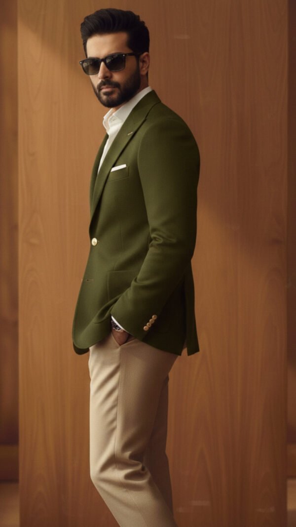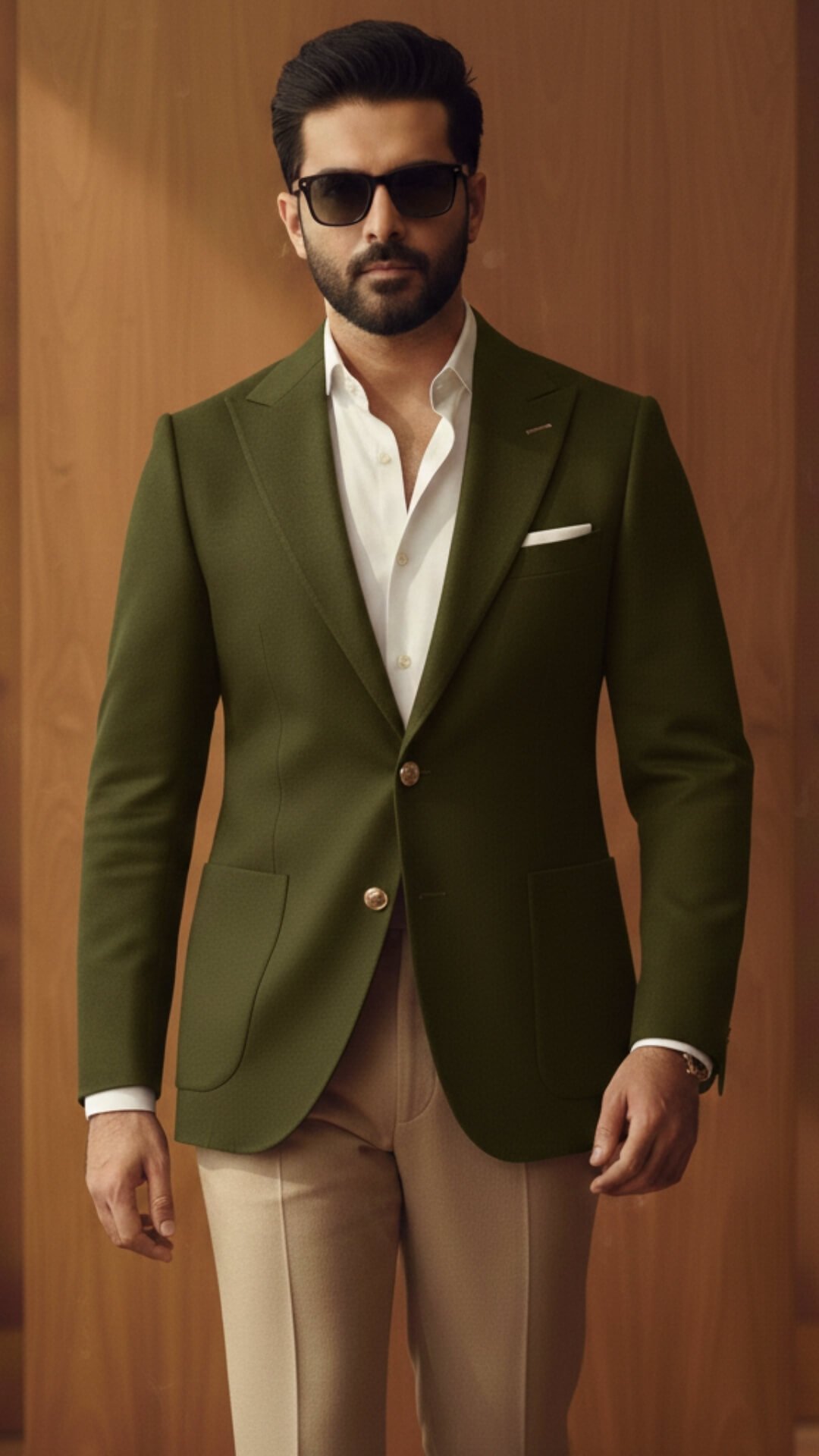 AN OLIVE GREEN BLAZER, TAILORED WITH A SOFT STRUCTURE AND A CLEAN, MODERN SILHOUETTE. DESIGNED TO ADD QUIET CHARACTER AND EFFORTLESS STYLE TO EVERYDAY DRESSING.