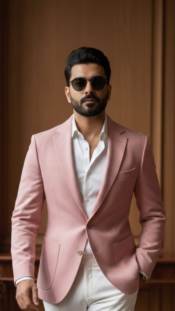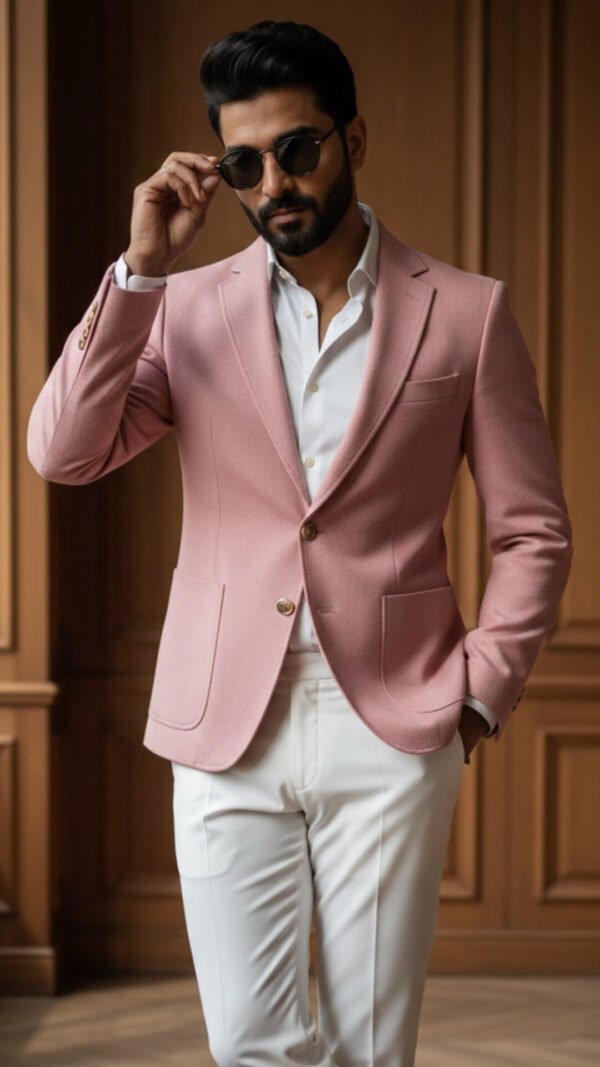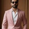 A PINK BLAZER, TAILORED WITH RELAXED PATCH POCKETS AND SUBTLE JUMP STITCHING ALONG THE LAPELS. DESIGNED FOR THE MODERN GENTLEMAN WHO APPRECIATES QUIET DETAIL.