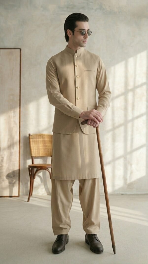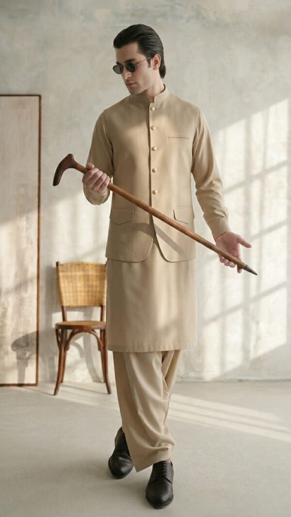 PREMIUM BEIGE KURTA, PAJAMA & WAISTCOAT — WITH CLEAN LINES AND CUSTOMIZABLE FIT.