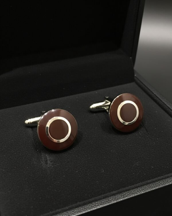 Rich & Polished: Deep brown enamel framed by sleek silver.