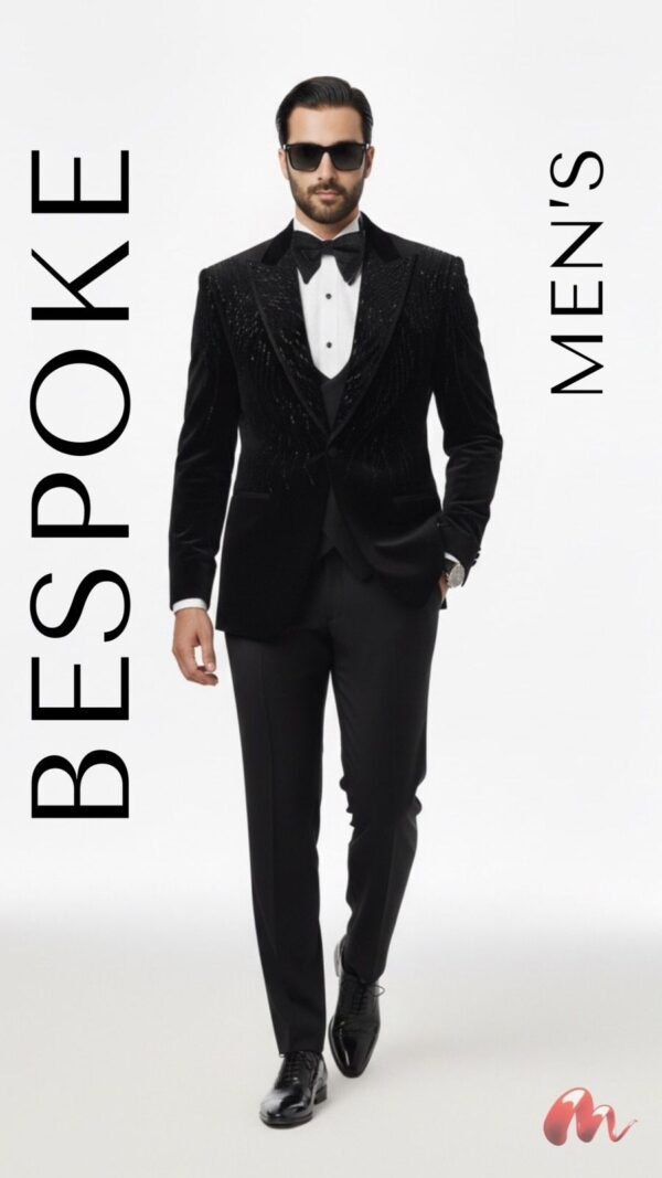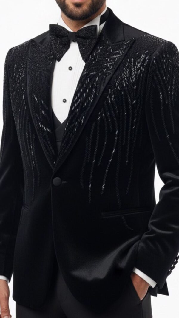 CRAFTED ON A PREMIUM BLACK VELVET BASE, THIS BESPOKE TUXEDO FEATURES INTRICATE HAND EMBROIDERY ACROSS THE LAPELS AND SHOULDERS, CREATING DEPTH, DRAMA, AND A LIGHT-CATCHING FINISH.